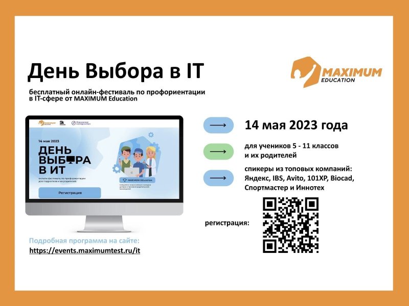 14 мая 2023 года состоится бесплатный онлайн-фестиваль по профориентации “День Выбора в IT” для обучающихся 5-11 классов и их родителей.