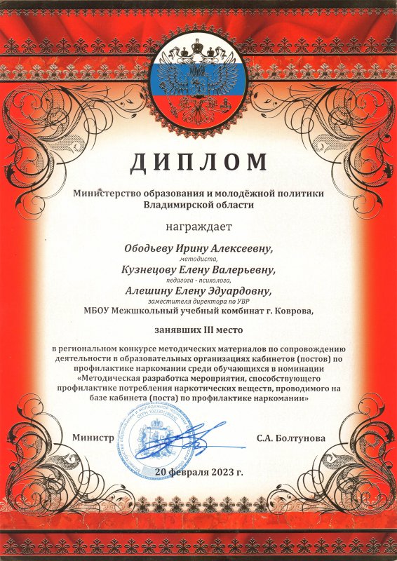 Методическая разработка мероприятия, составленная специалистами городского кабинета наркопрофилактики Межшкольного учебного комбината, стала призером конкурса.