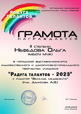 С 06 по 13 июня состоялась городская выставка-конкурс художественного и декоративно-прикладного творчества учащихся “Радуга талантов”, в которой приняли участие 80 участников и 13 образовательных учреждений города Ковров, представив 77 экспонатов.