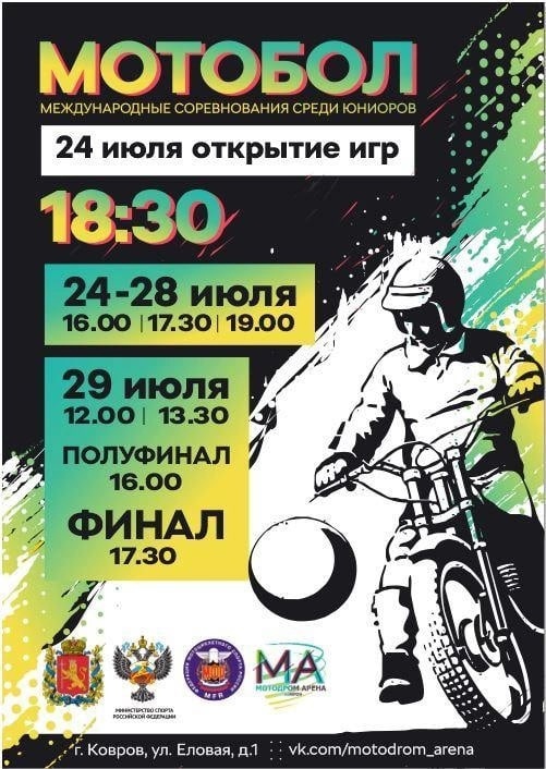 24 - 29 июля в Коврове пройдут Международные соревнования по мотоболу среди юношей 13 - 18 лет. Турнир соберет мотобольные команды России и Республики Беларусь. Наш город представит юниорский состав спортивной школы «Мотодром Арена».