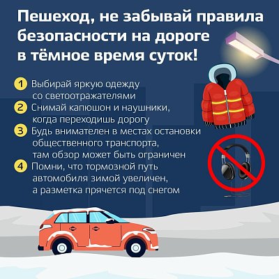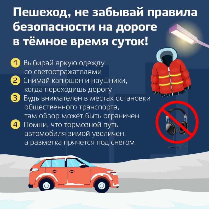 Напоминаем, что важно соблюдать правила безопасности при движении по проезжей части в тёмное время суток! Пока световой день ещё короткий, а погодные условия осложняют ситуацию на дороге, призываем уделить особое внимание правилам поведения, повторно проинформировать детей по этой теме и напомнить пожилым людям о том, как и где правильно переходить дорогу. Внимание и взаимоуважение – качества ответственного пешехода и хорошего водителя!